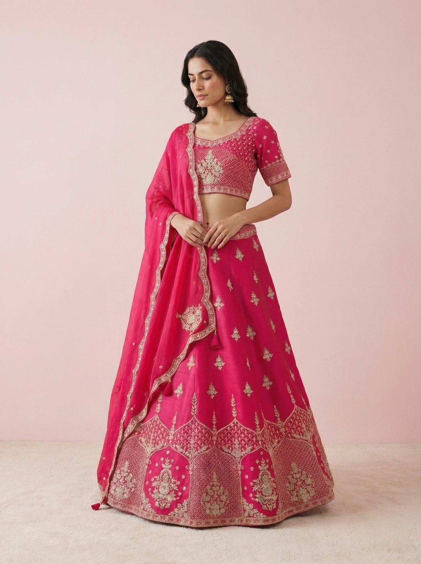 • Dark Pink Hand Embroidered Raw Silk Lehenga With Readymade Blouse