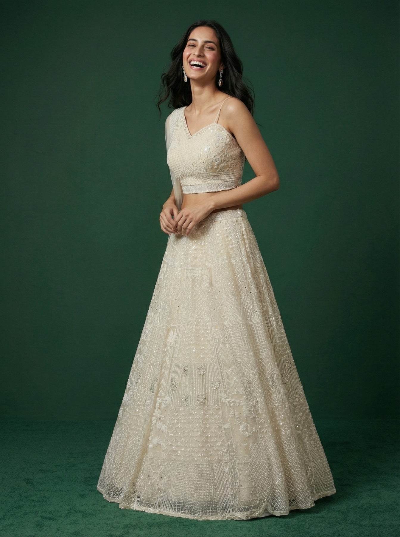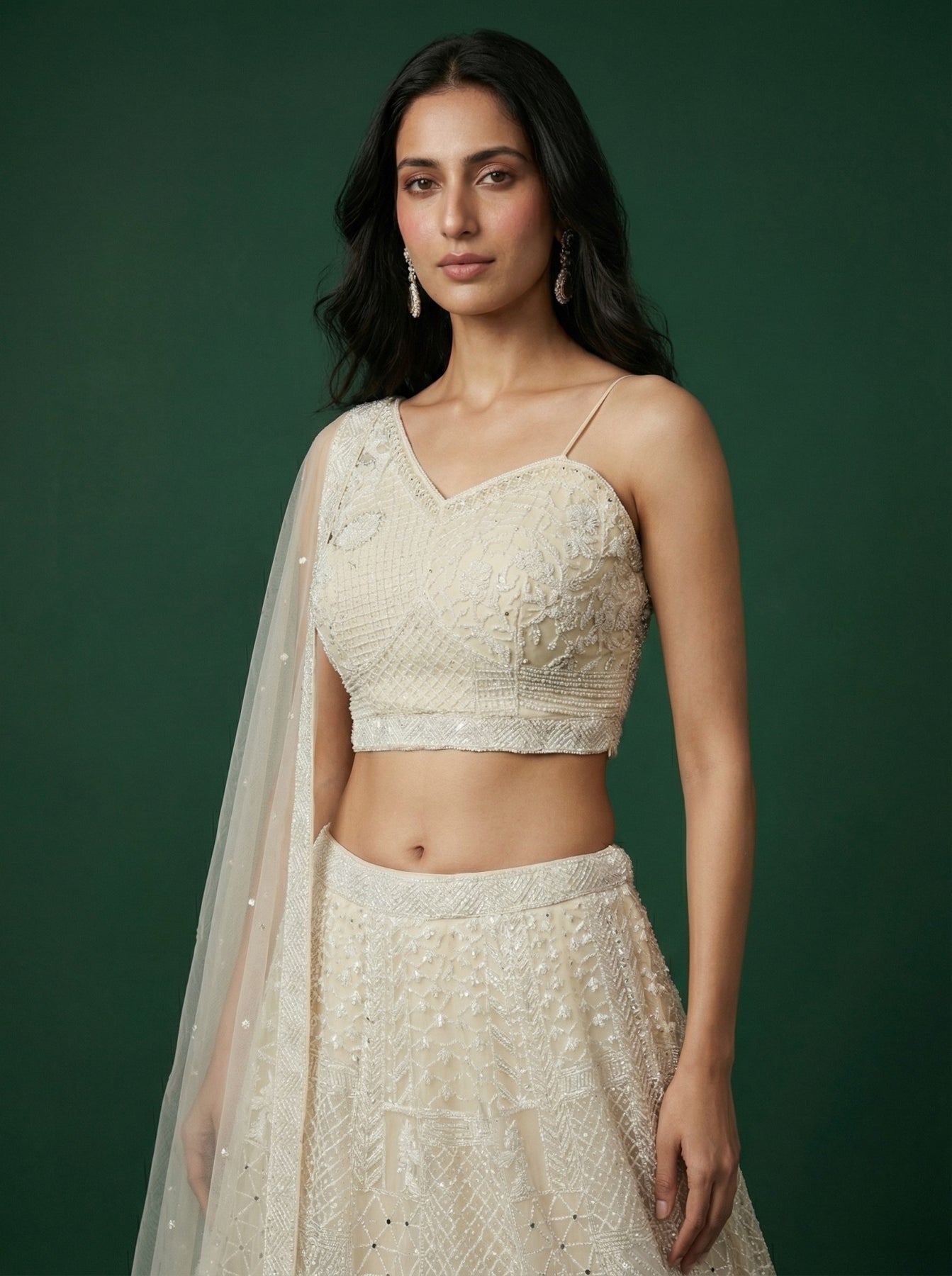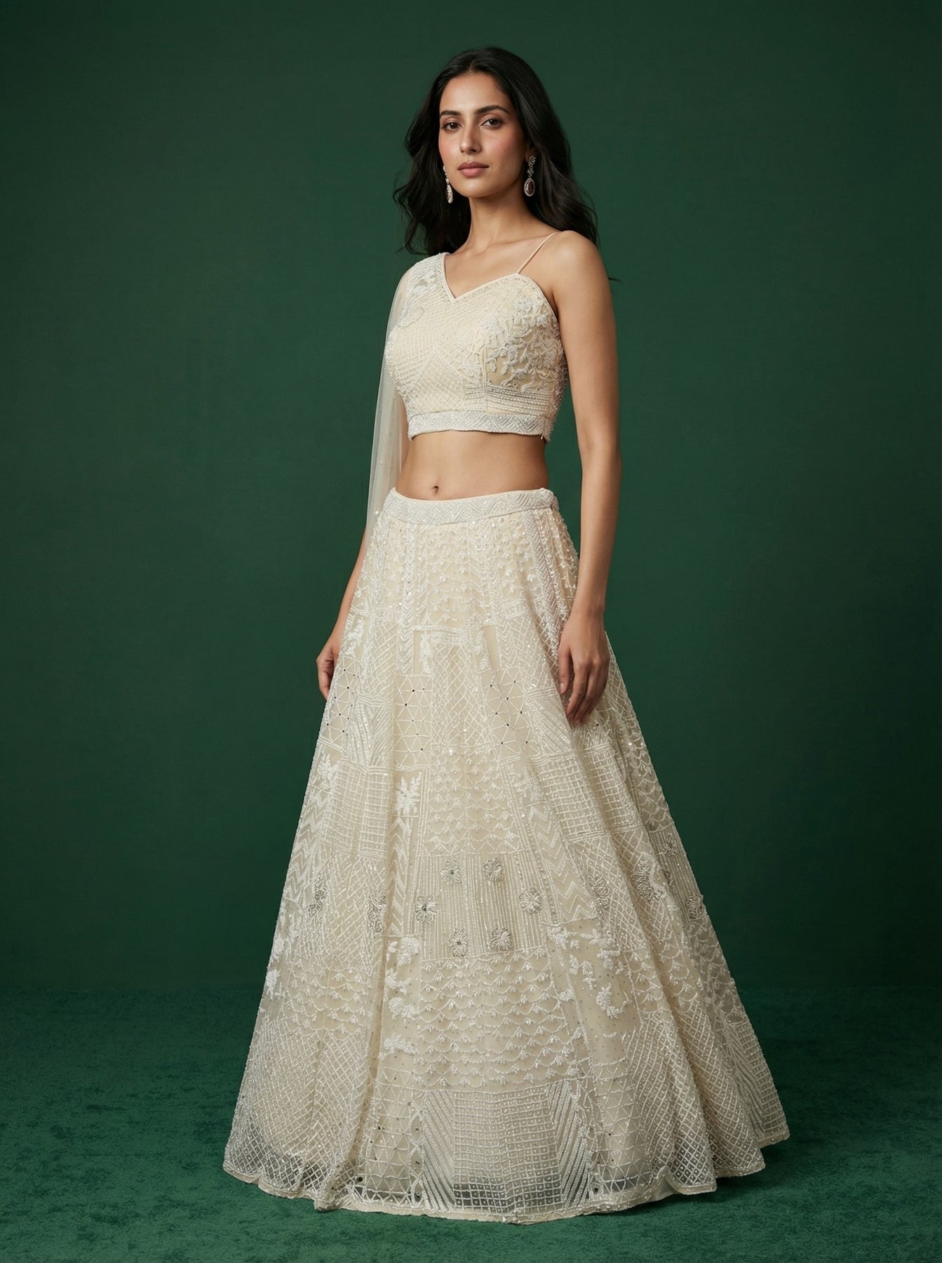 • White Net Sequinned Off Shoulder Lehenga