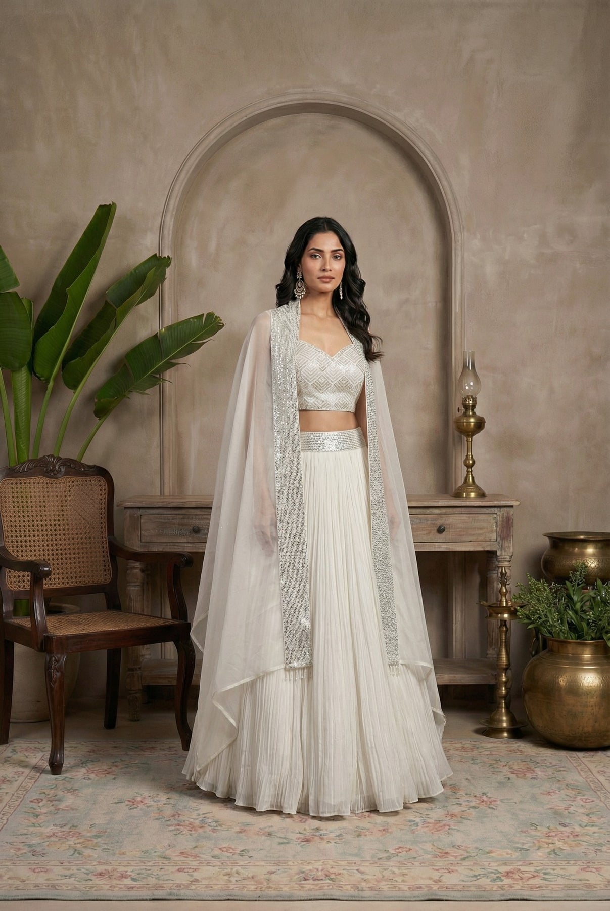 White Net Crop Top Lehenga With Shrug