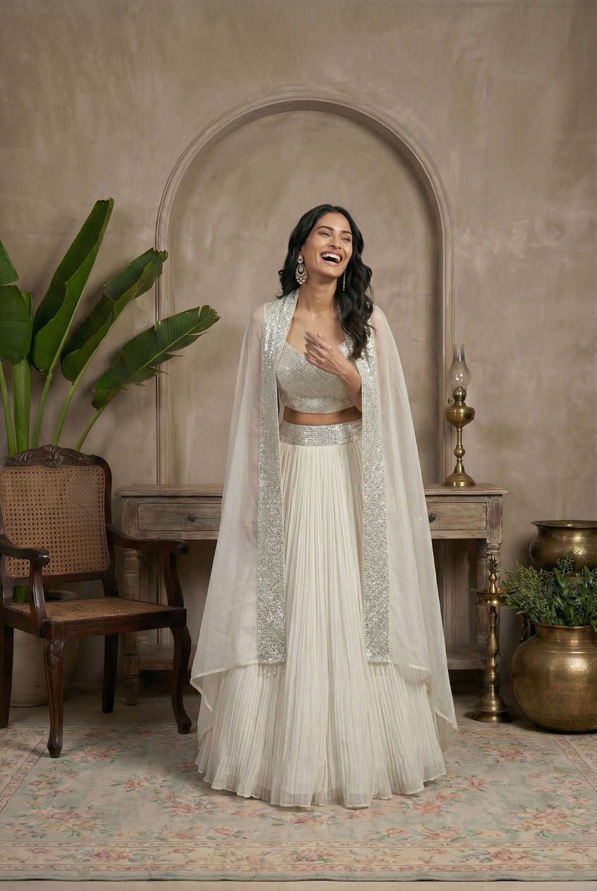 • White Net Crop Top Lehenga With Shrug