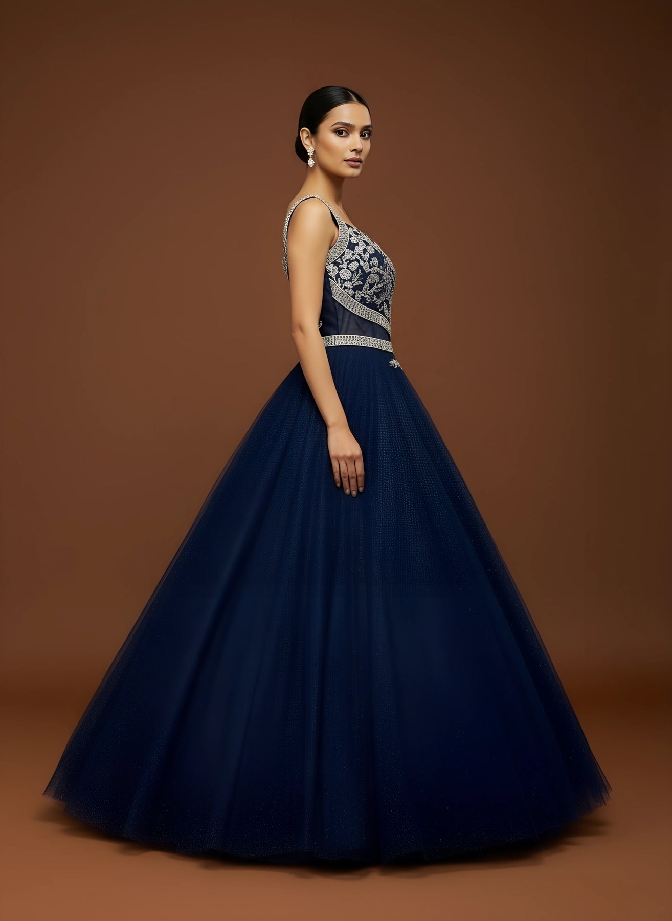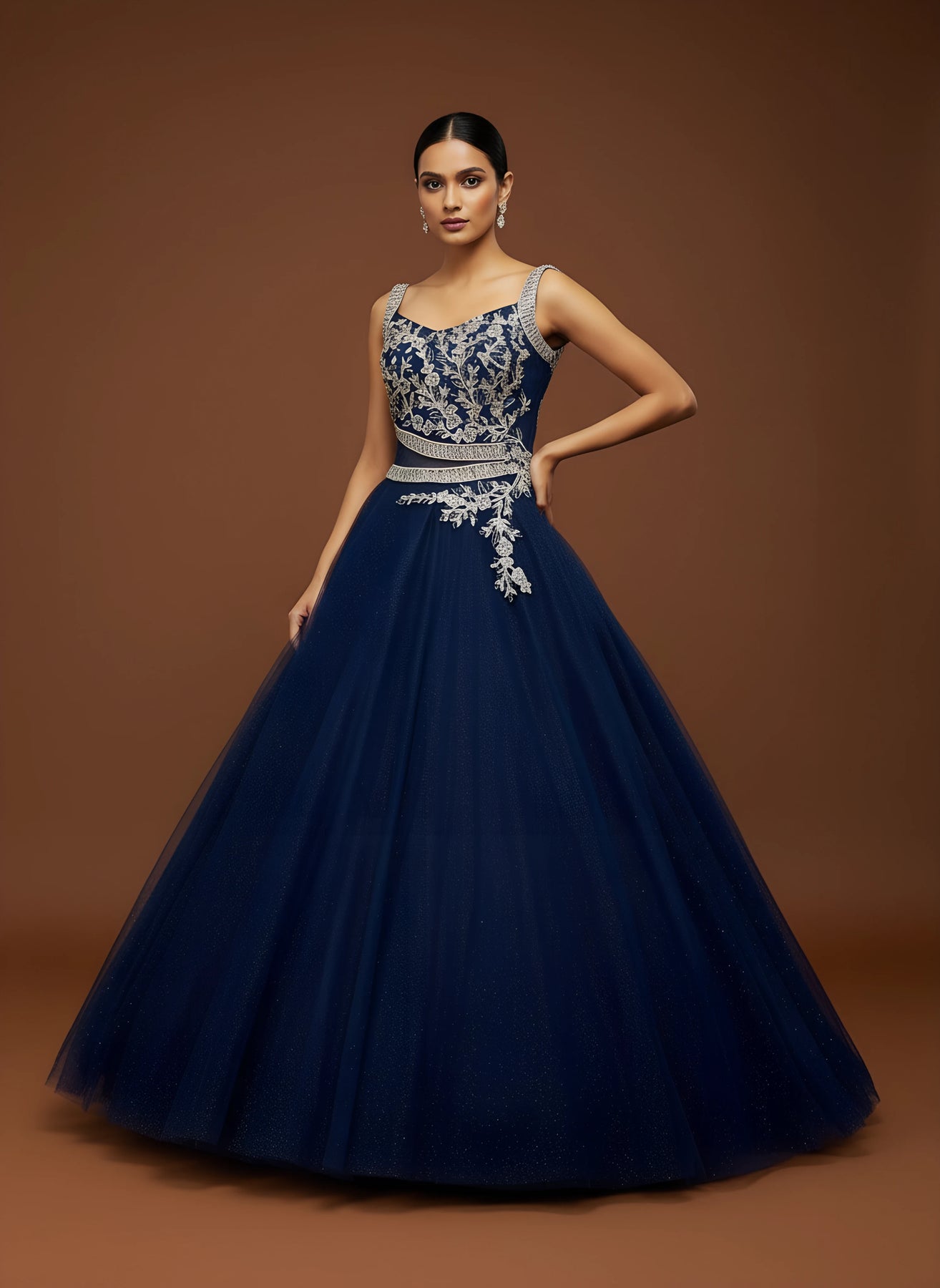 Navy Blue Sequins Embroidered Net Engagement Gown