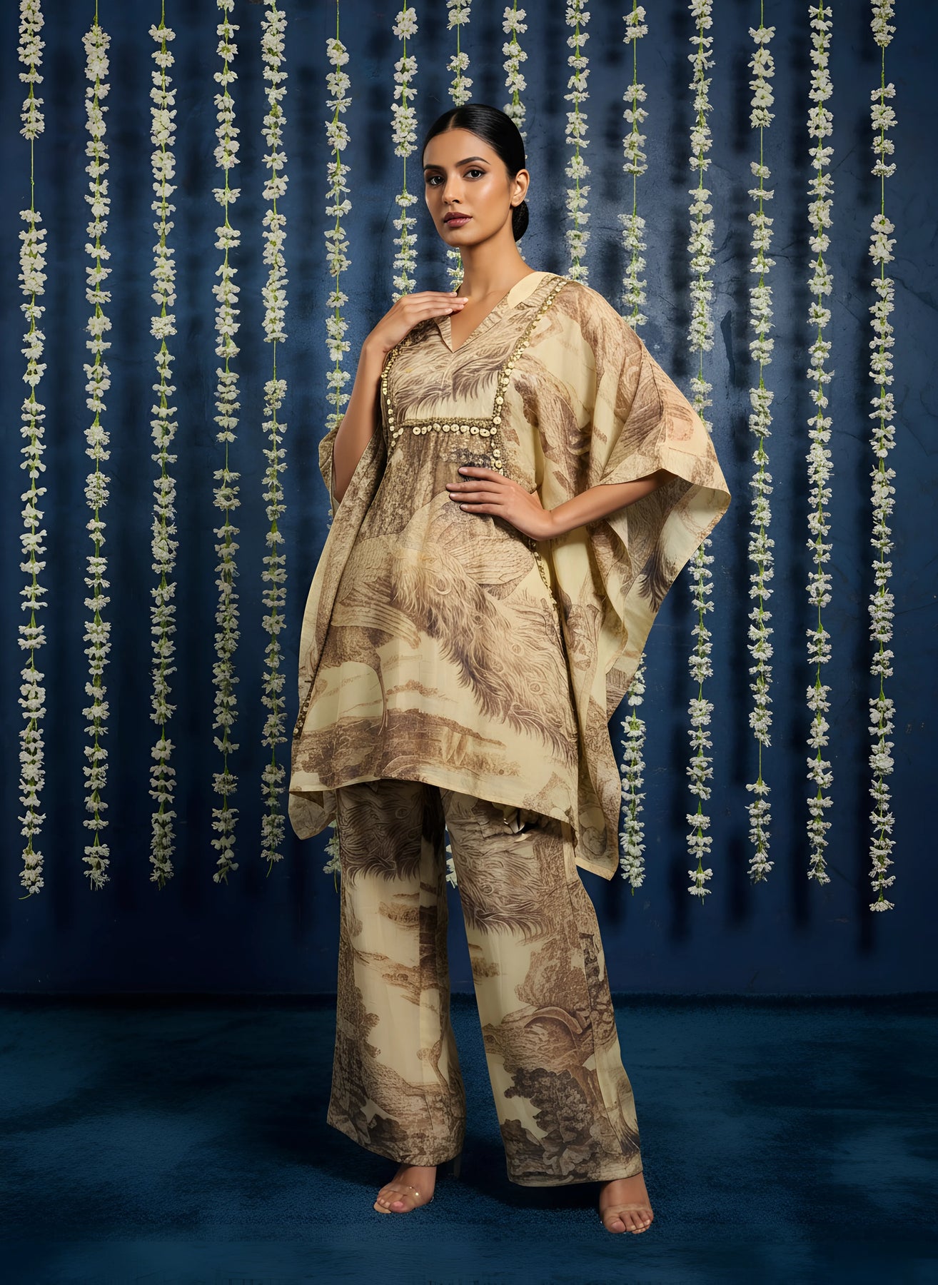 • Beige Marbel Print Top With Bottom Trouser