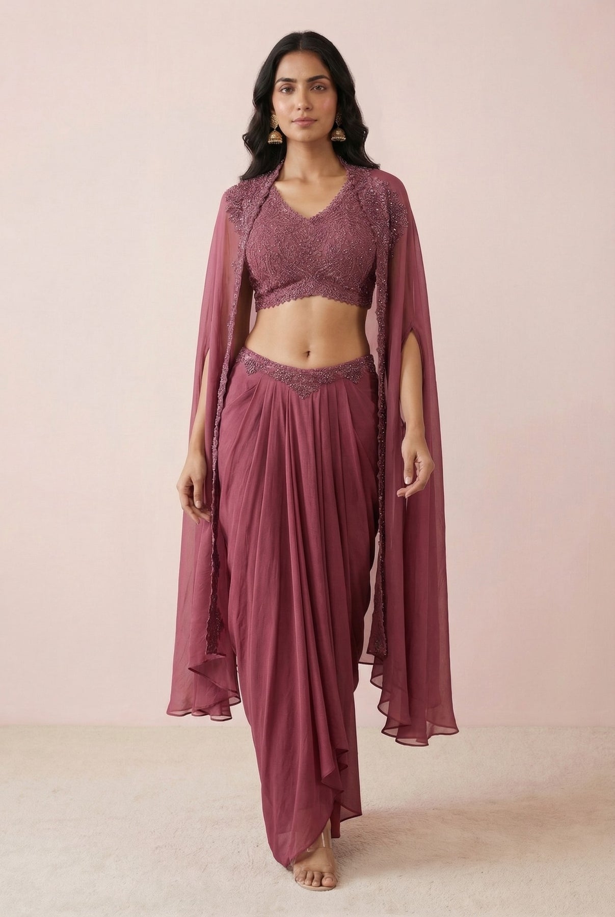 Fuchsia Pink Embroidered Bodice With Shrug & Drape Skirt