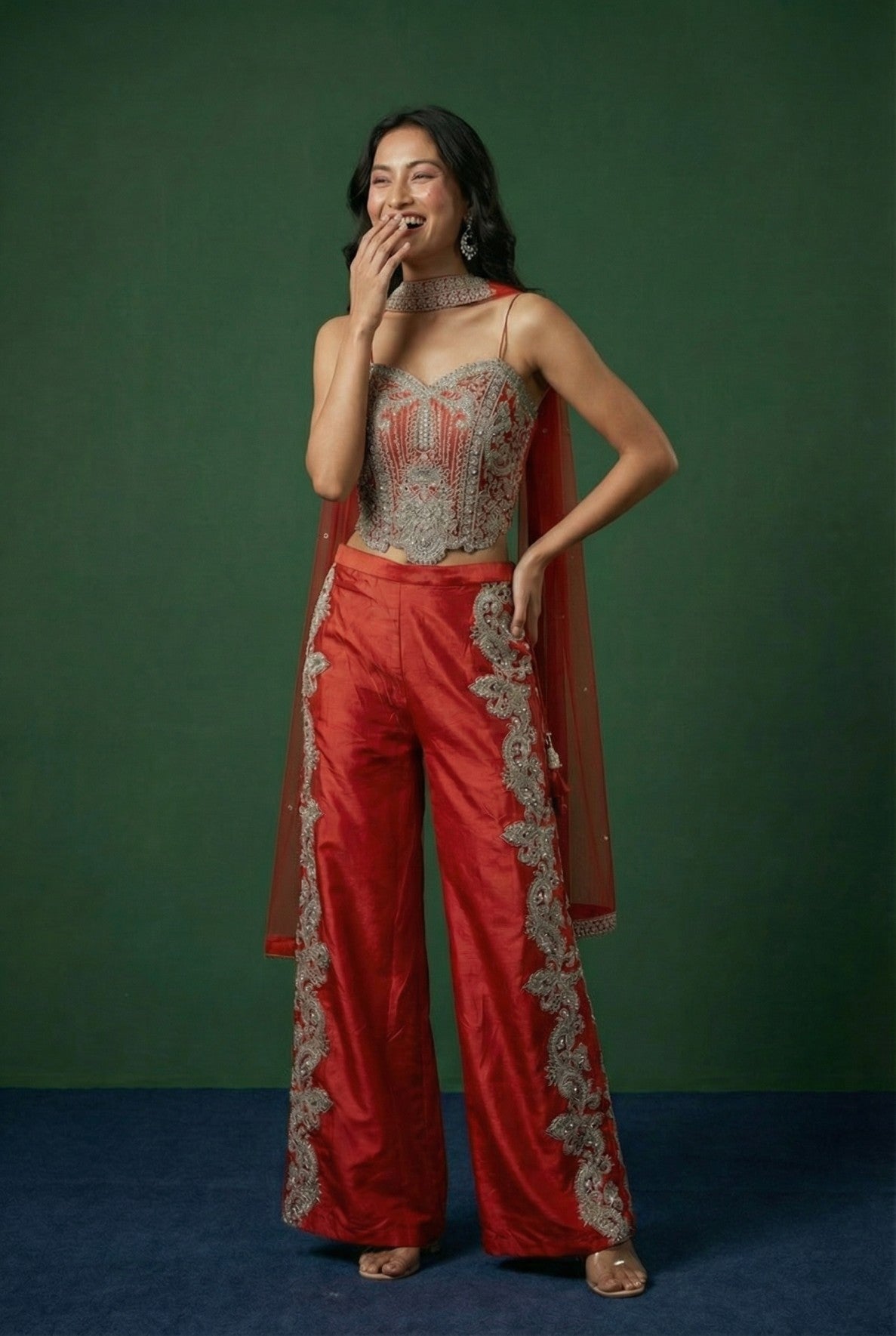 Woman wearing a ORANGE outfit with intricate silver detailing against a green background