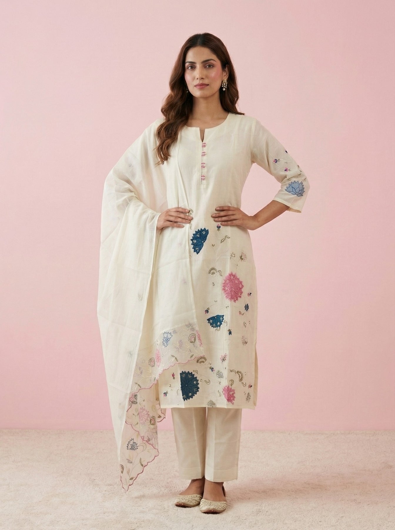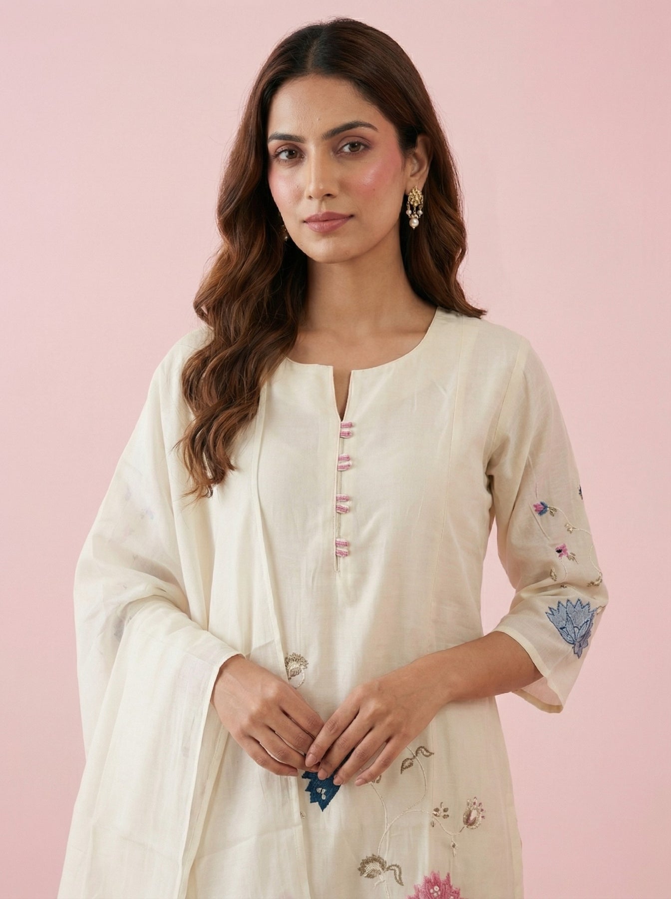 White Cotton Embroidered Suit Set With Dupatta