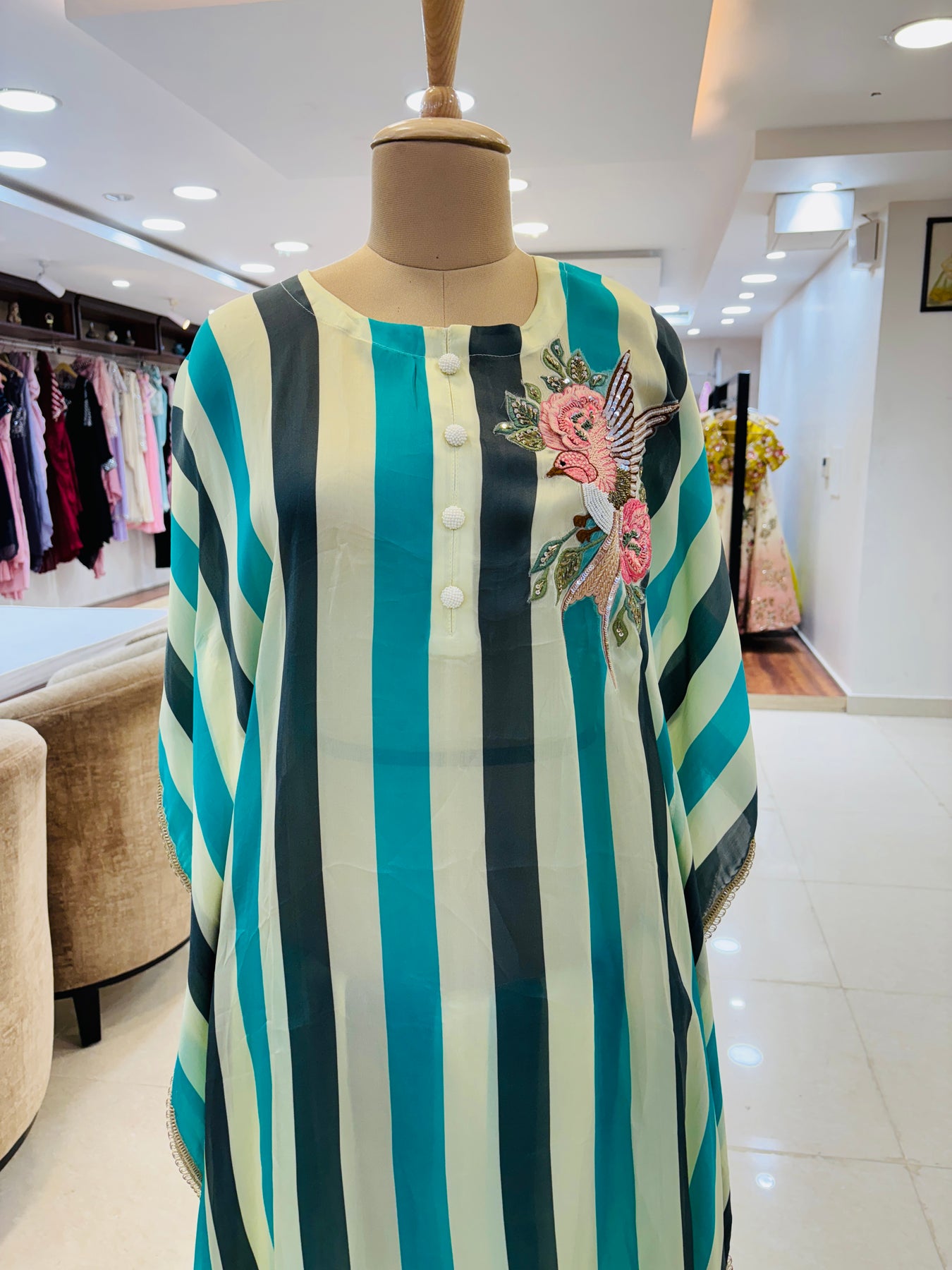 Sea Green & Beige Organza Silk Kaftan Set