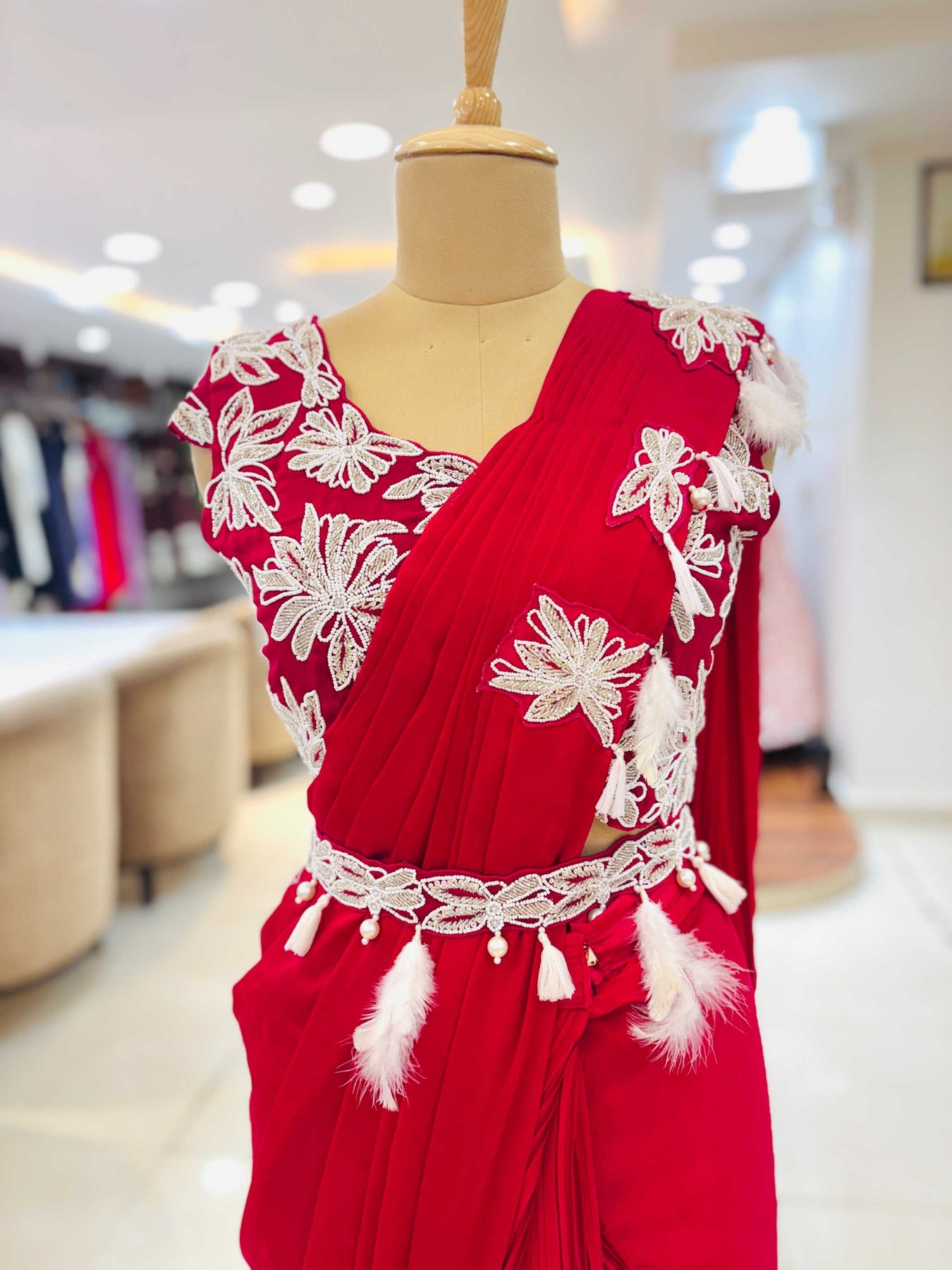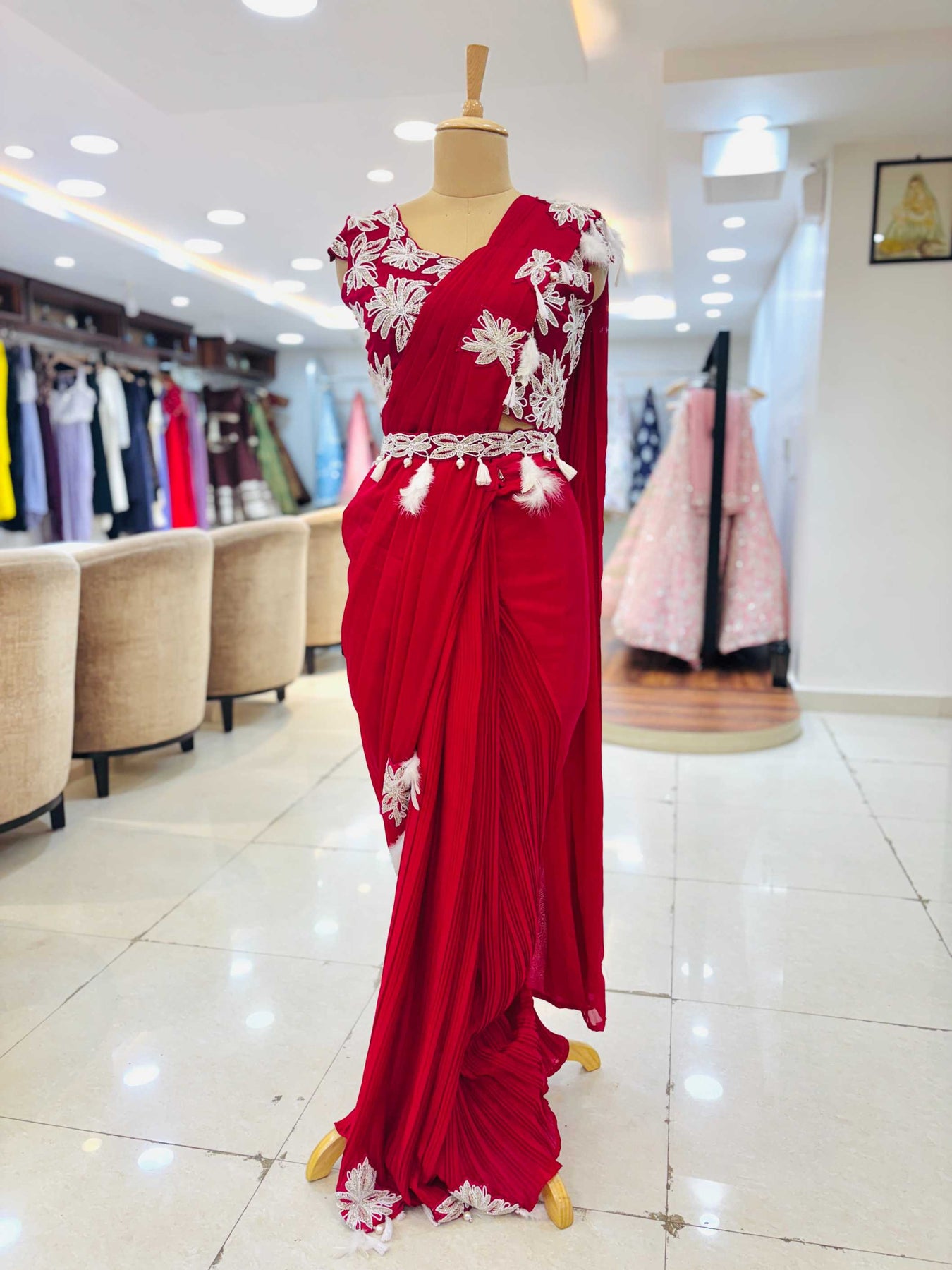 • Dark Red Georgette Pre Drape Saree