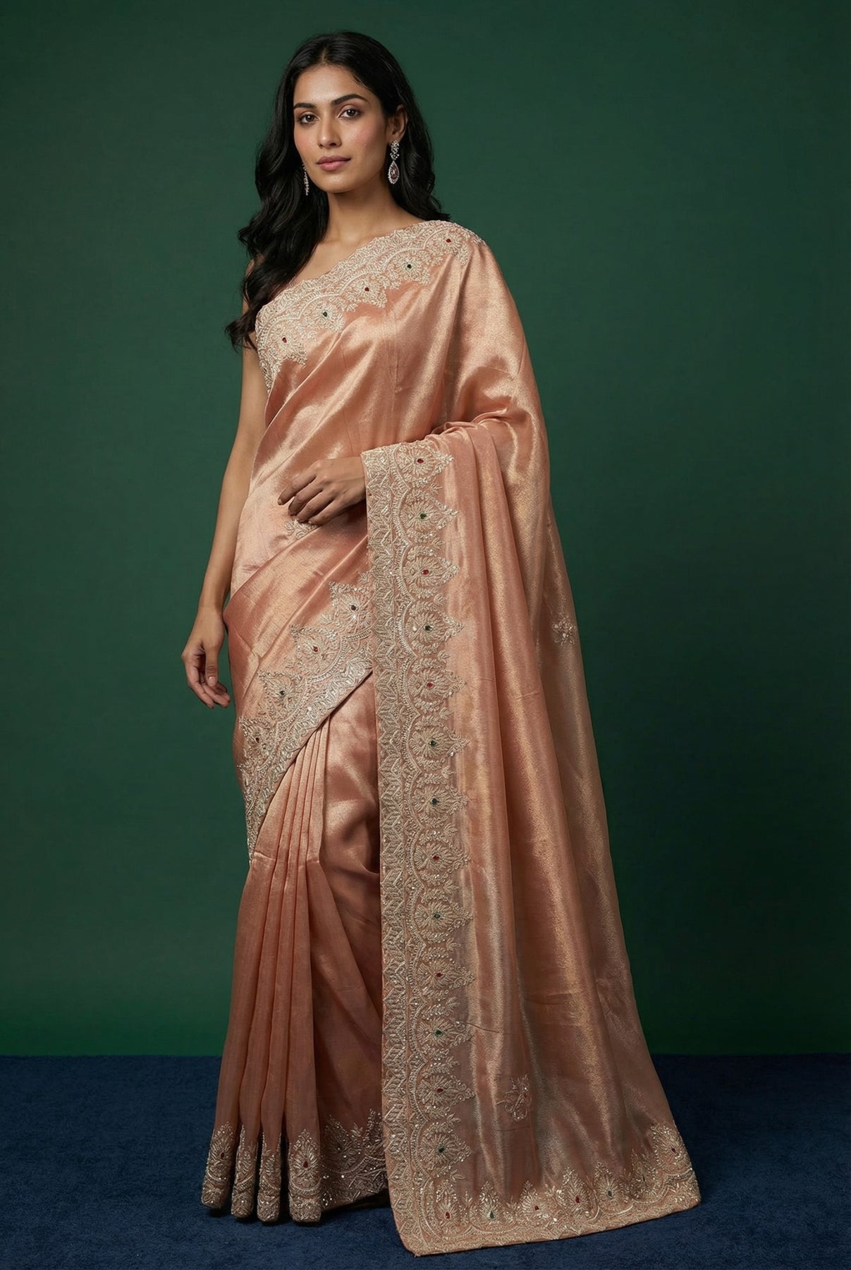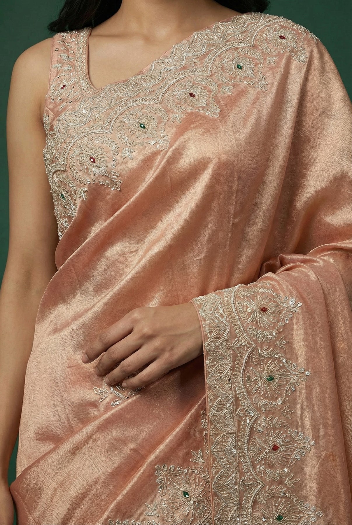 • Light Peach Hand Embroidered Silk Saree
