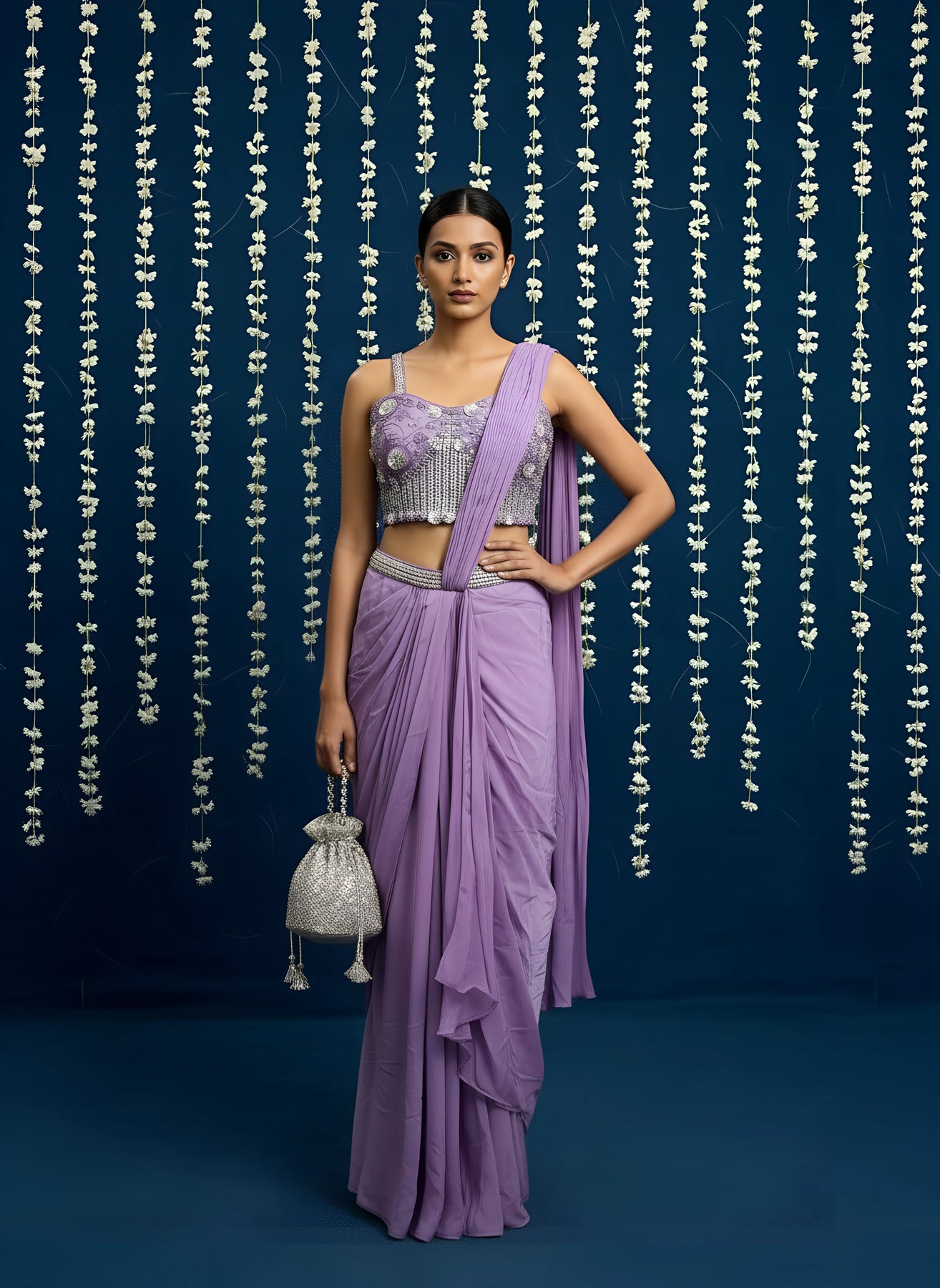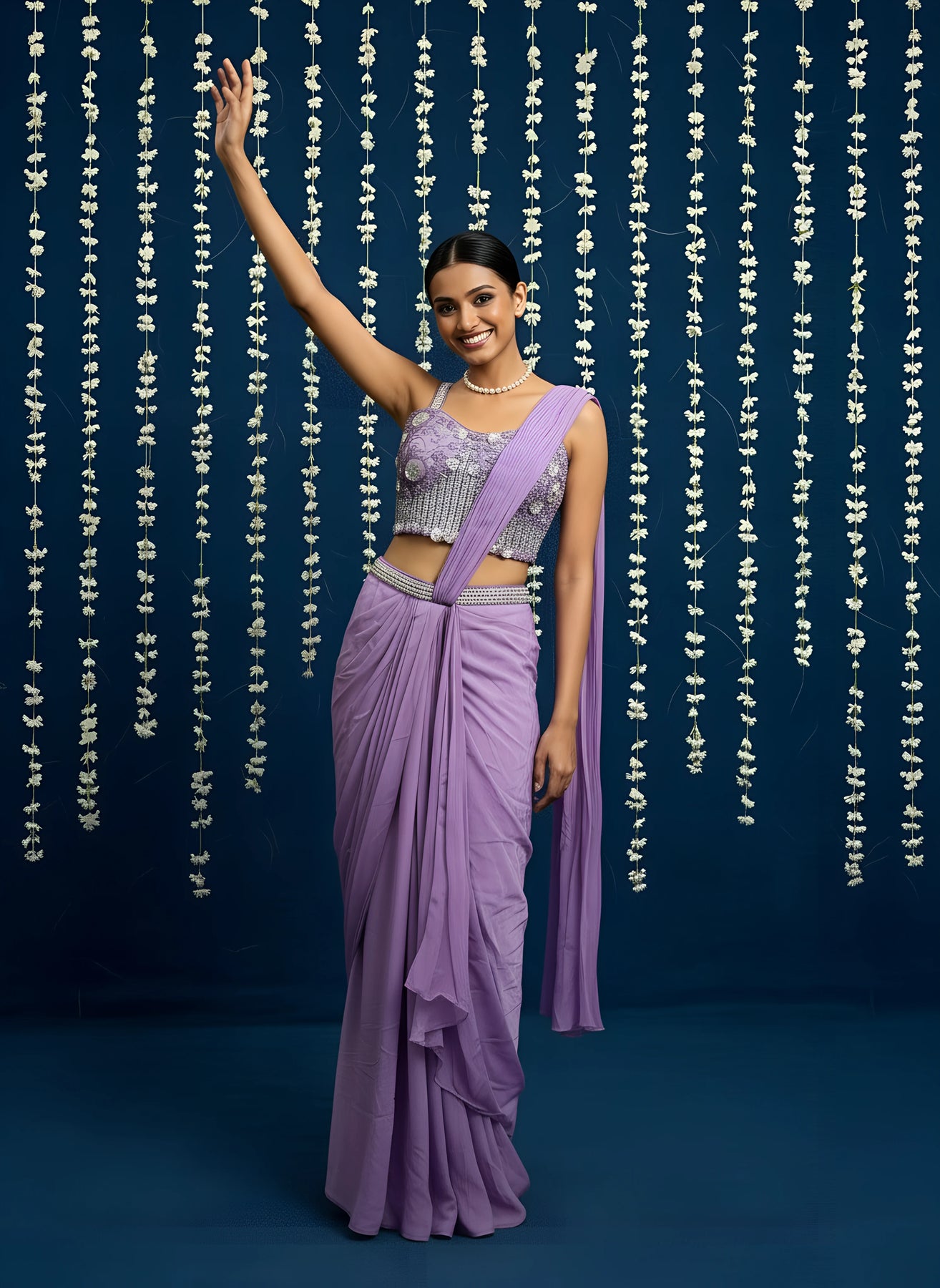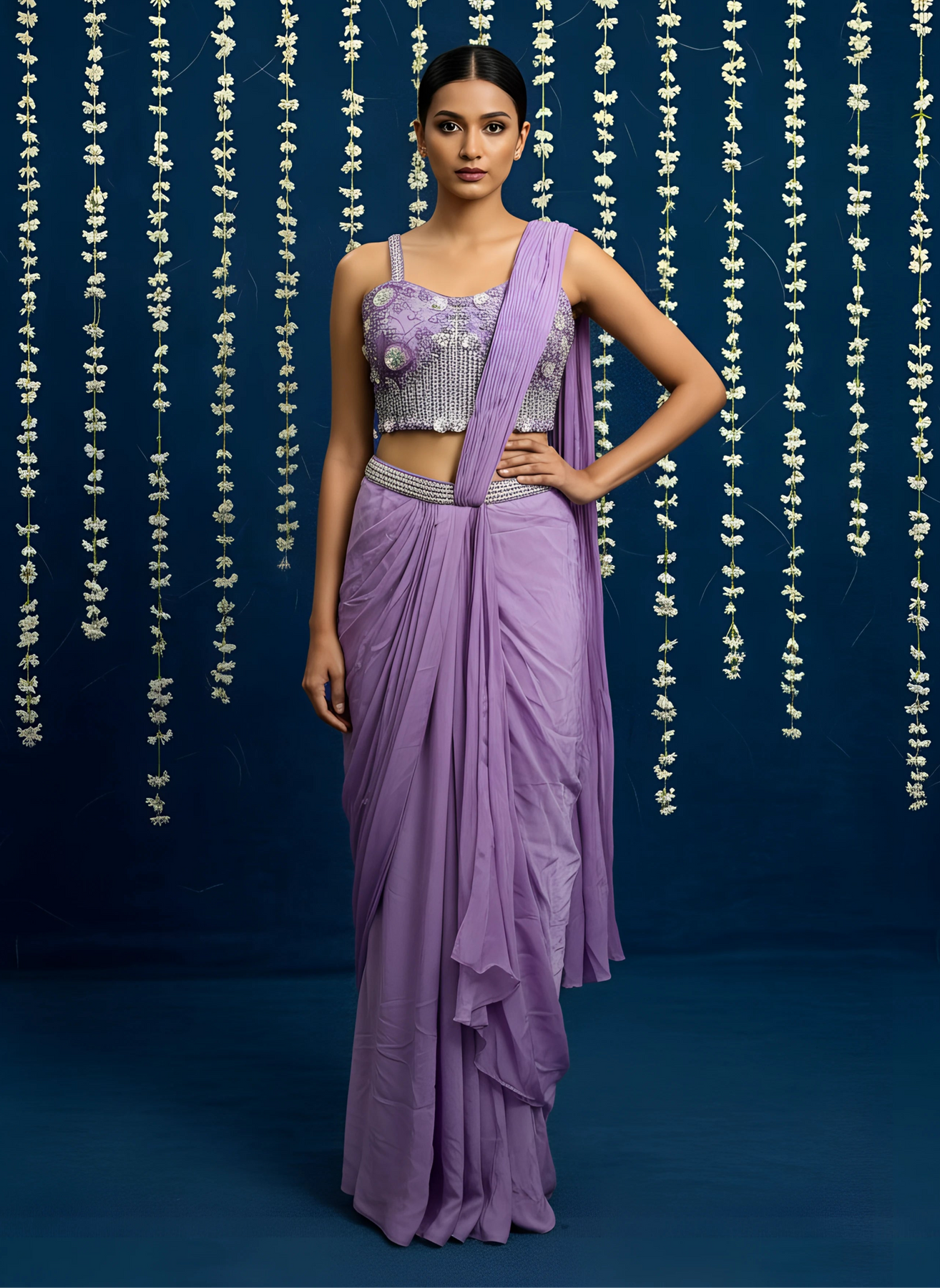 • Purple Chinnon Silk Drape Saree With Readymade Blouse