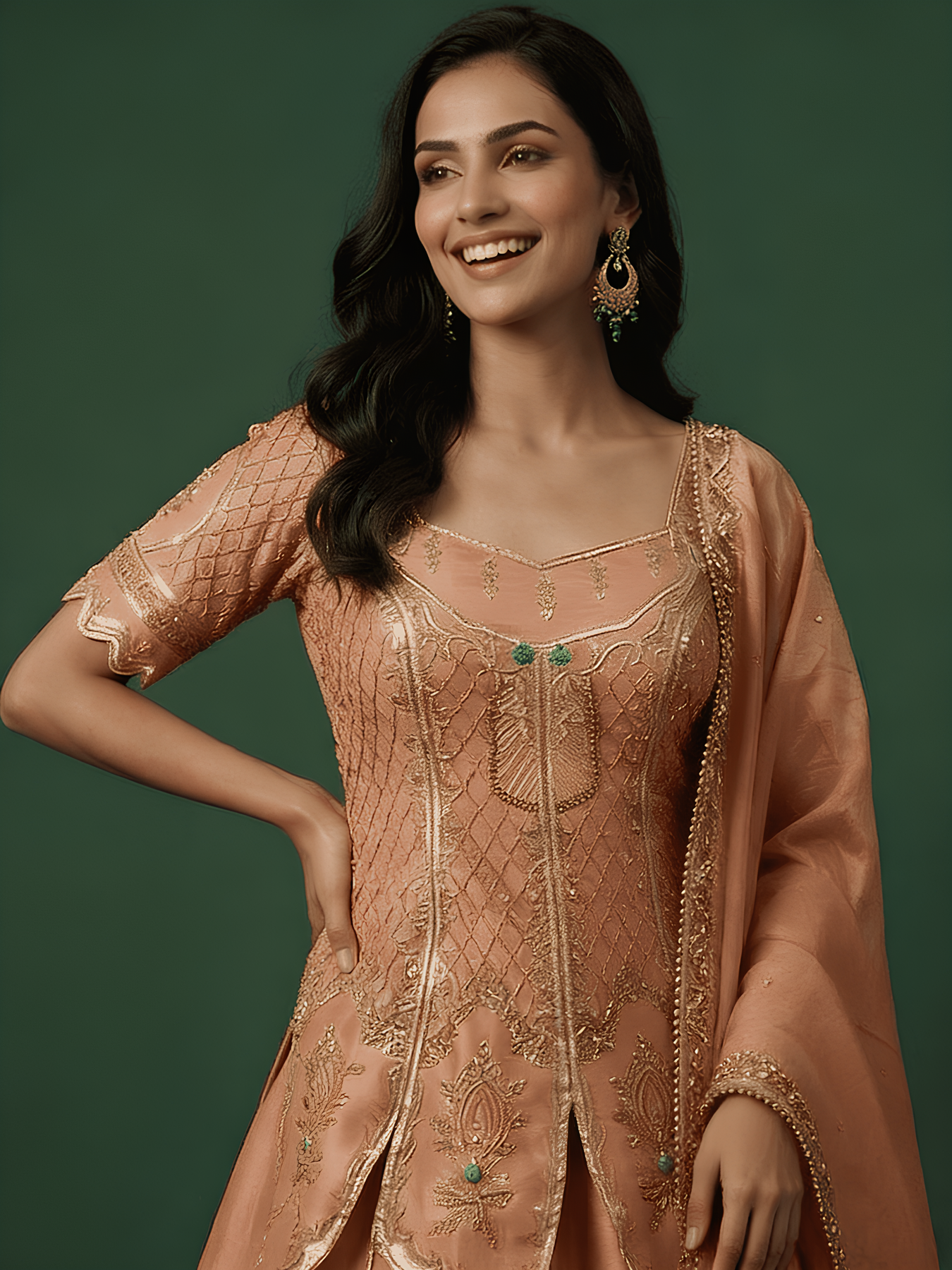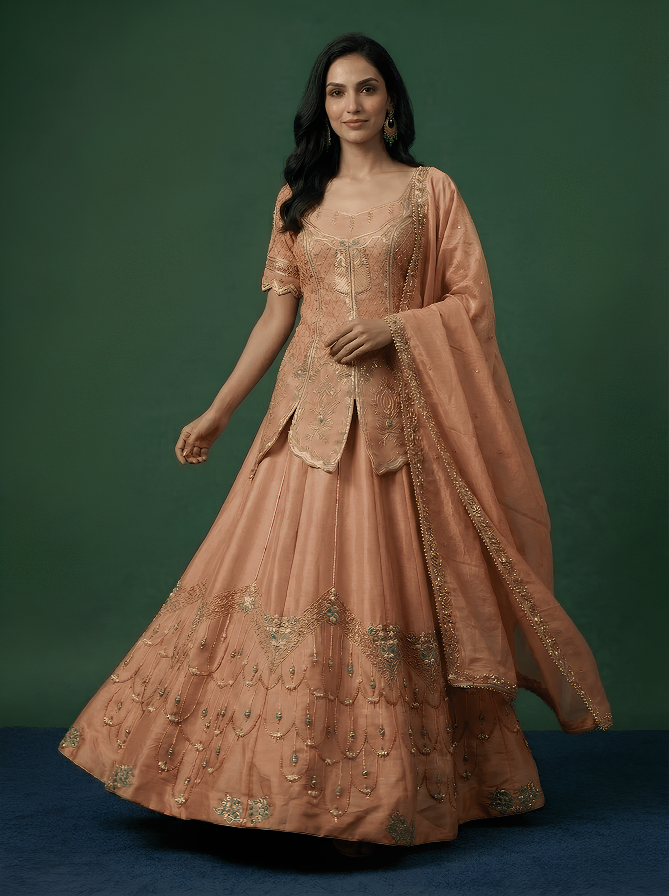 • Peach Hand Embroidered Long Kurti With Lehenga